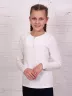 Блузка для девочек младшего и старшего школьного возраста, из трикотажного полотна кулирка с лайкрой. Блузка прилегающего силуэта, с втачным рукавом, с центральной застежкой на спинке на петлю и пуговицу, с воротником из шифона. Спереди отсутствуют линии членения. На спинке вырез в виде капельки под застежку. Рукав одношовный, длинный. Низа рукавов и изделия подогнуты. Воротник состоит из двух частей со складками. Спереди по центру прикреплена брошь.