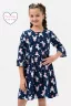Платье для девочек дошкольного и младшего школьного возраста, из трикотажного полотна кулирка с лайкрой с рисунком. Силуэт прилегающий, отрезное и расклешенное от линии талии, рукав 3/4 втачной одношовный. По низу рукава широкий волан, выполненный из основного материала. Срез горловины окантован.