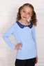 Блузка для девочек младшего и старшего школьного возраста, из трикотажного однотонного полотна – кулирка с лайкрой. Блузка полуприлегающего силуэта, с втачным длинным рукавом, с кружевным воротником, с центральной застежкой на петлю и пуговицу на спинке. Спереди отсутствуют линии членения. На спинке вырез в виде «капельки». Срез горловины и капля окантованы. Рукав одношовный. Низа рукава и изделия подогнуты. Спереди по центру горловины прикреплен декоративный элемент.