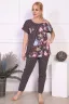 Женский костюм состоит из футболки со спущенной проймой и брюк. Игра полосок с добавлением цветов - этот костюм впишется в гардероб практически любой женщины. Широкий размерный ряд, удобный крой - подойдет на любую фигуру. Брюки с манжетами по низу и простроченной резинкой - можно носить как с кроссовками, так и с босоножками. В этом костюме - вы не останетесь незамеченной.