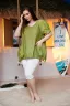 Туника женская, свободная, расклешенная к низу, в стиле "бохо". Рукав реглан с тремя складками, на манжете, короткий. Горловина округлая. На полочке два накладных кармана с обтачкой , вверху на кармане встречная складка, внизу сборка. Низ туники фиксируется завязками.