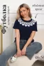 Футболка женская прямого силуэта. Низ изделия прямой. Длинна до середины бедра, плечо на естественном месте, рукав короткий. Горловина круглой формы, обработана планкой . Принт (шелкография пуф) в виде кружевного воротника.