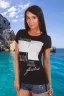 Футболка полуприлегающего силуэта, с округлой горловиной, длиной до середины бедра. Рукав втачной короткий. На полочке расположены декоративные элементы из отделочного полотна. Горловина обработана бейкой