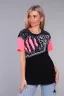 Футболка женская классическая прямого покроя, основной цвет черный, рукава 2 цветов - розового и зеленого. Оригинальный принт на полочке.