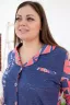 Халат женский полуприлегающего силуэта. Воротник английского типа, рукав втачной 3/4. Застежка на петли - пуговицы. Воротник, спинка, рукава и обтачка нагрудного кармана из отделочной ткани. На полочках два внутренних кармана, на левой полочке нагрудный карман, на правой полочке принт.