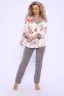 Домашний женский костюм из мягкого, теплого флиса. Кофта полуприлегающего силуэта, застегивается на петли и пуговицы. Длиной до бедер с фигурной линией низа. Рукав втачной, длиной 3/4 с манжетом из отделочной ткани. Воротник пиджачного типа с закругленными углами, из отделочной ткани. Борта, воротник и лацканы отстрочены. Домашние брюки прямого кроя с вместительными карманами в боковом шве, комфортный пояс на резинке, располагается на линии талии, длина брюк ниже щиколотки.