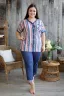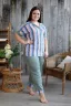 Костюм женский: туника и брюки 7/8. Застежка на петли - пуговицы. Туника и манжеты брюк из ткани в полоску. Борт туники, низ рукавов и обтачка накладного кармана полочки обработаны широкой окантовкой из отделочной ткани. Брюки полуприлегающие на поясе, обработанном на многоигольной машине. На передней части брюк два внутренних кармана. На модели 52 размер