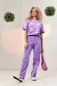 Костюм состоит из футболки и брюк. Футболка прямая, свободная, с округлой горловиной. В нижней части боковых швов футболки обработаны разрезы. Рукав короткий. Горловина обработана обтачкой из основного полотна. Брюки прямые, на поясе, с боковыми карманами, с накладными карманами и клапанами по боковым швам.