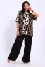 Трикотажный комплект из вискозы с удлиненной футболкой и боковыми разрезами и широкими брюками.