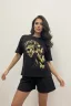 Удобный женский трикотажный костюм с шортами и футболкой свободного кроя отлично подойдет для прогулок, для активного отдыха, походов за покупками, да и просто для дома. Эта модель произведена из качественного хлопка. на футболку нанесен оригинальный принт.