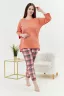 Костюм женский: туника и брюки. Туника прямого силуэта с округлой горловиной, в боковых швах разрезы, на полочке стильный принт. Брюки из ткани в клетку, на поясе, простроченном на многоигольной машине. Низ брюк собран на эластичную тесьму. На передней половинке брюк внутренние карманы.