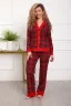 Пижама с брюками представлена в двух расцветках: лёгкий белый цвет с красными сердечками и классическая клетка на красном. Кофта с длинным рукавом с манжетами, низ изделия и застежка обработаны контрастной обтачкой. Кофта с застёжкой на пуговицы, с элегантным V-образным вырезом. брюки с "ленинградскими" боковыми карманами, притачной пояс, низ брюк обработан контрастными манжетами.