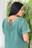 Платье прямого силуэта с цельнокроенным коротким рукавом на манжете. Вырез горловины спереди и сзади Y-образный. Обтачки горловины, накладных карманов, низ изделия и манжеты рукавов из отделочной ткани в полоску, накладные карманы на полочке в клетку