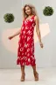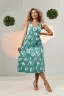 Сарафан трапециевидного силуэта, с V-образной горловиной, длиной ниже колена. В нижней части боковых швов обработаны разрезы. Горловина и проймы обработаны бейкой из основного полотна.