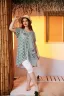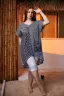 Туника женская, свободная, к низу расширенная. Рукав цельнокроеный короткий. Горловина Y-образная. Туника из двух полочек, одна полочка и кокетка спинки: в горошек, другая полочка, кокетка полочки и спинка: в полоску. На полочке в полоску большой накладной карман из ткани в горошек с декоративной кокосовой пуговицей на вертикальном хлясте. На полочке в горошек нагрудный карман в полоску с хлястом и декоративной кокосовой пуговицей. На спинке сзади складка для обеспечения достаточной свободы по бедрам. Низ туники фигурный, полочка короче спинки.