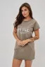 Женская туника-футболка выполнена в лаконичном стиле с прямыми линиями кроя. Ее отличает удобный фасон, подчеркивающий женственность фигуры. Модель оснащена круглым вырезом горловины и короткими рукавами типа реглан, обеспечивающими свободу движений и комфорт. Особенностью изделия является оригинальная отделка — низ туники оставлен с необработанными краями, создавая эффект легкой небрежности и современности. Центральное внимание привлекает стильный принт на груди с выразительной надписью "STYLE", украшенный сверкающими стразами, придающий образу дополнительную яркость и шарм.