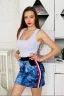 Юбка в спортивном стиле, полуприлегающего силуэта, длиной выше колена, с боковыми карманами, на эластичном поясе. Сзади расположены карманы из отделочного полотна, обработанные отделочной тесьмой. Вдоль боковых швов расположены лампасами из отделочной тесьмы.